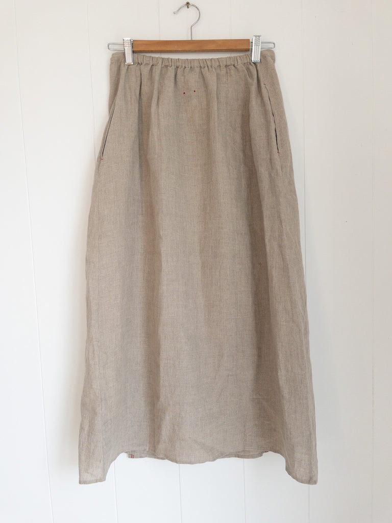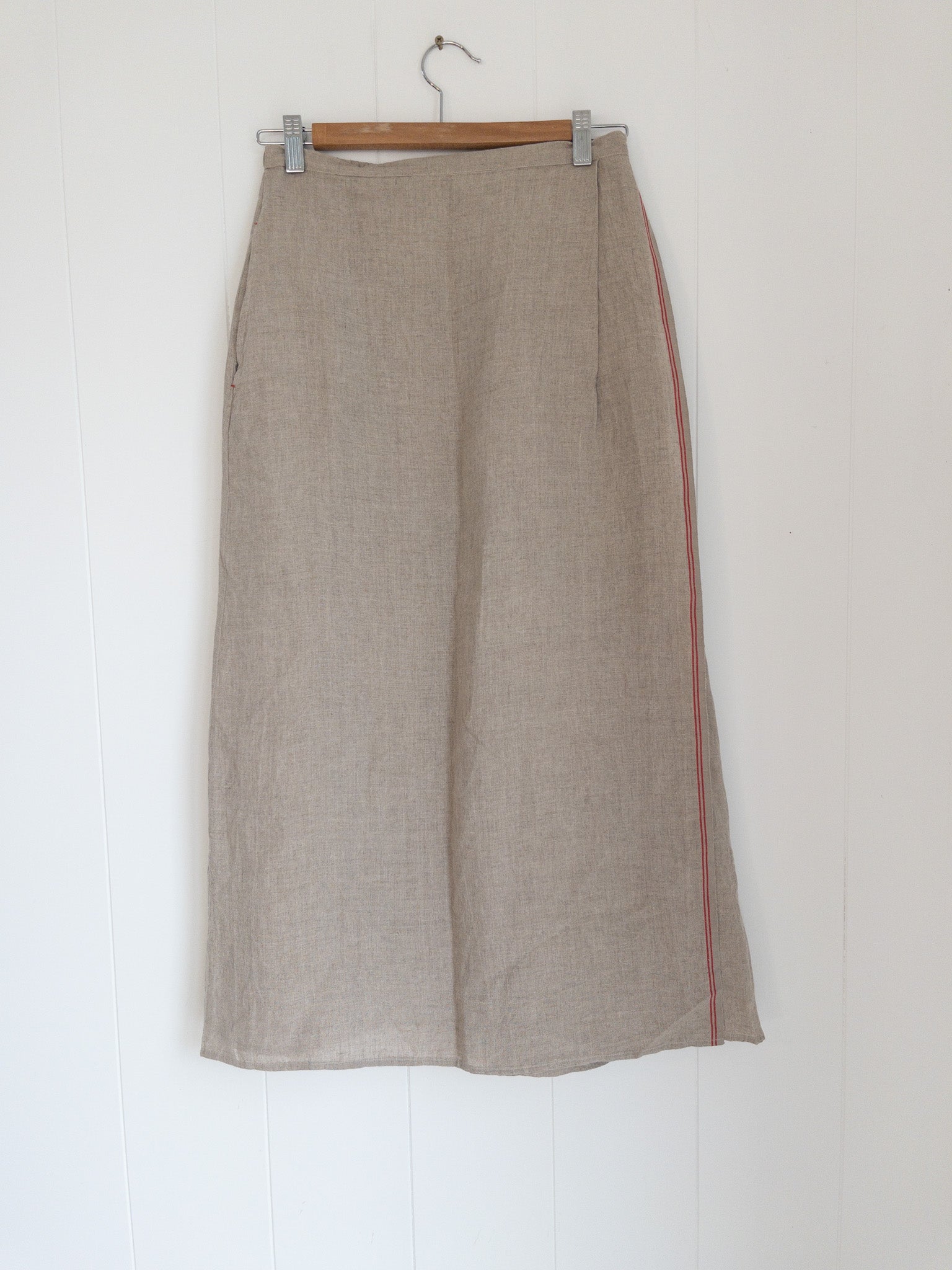 This linen skirt is a classic straight silhouette with a gathered waistband at the back and a flat wrap front front with button fastening. Lovely contrast double stripe finish down the wrap edge. Concealed pockets in the two side seams.