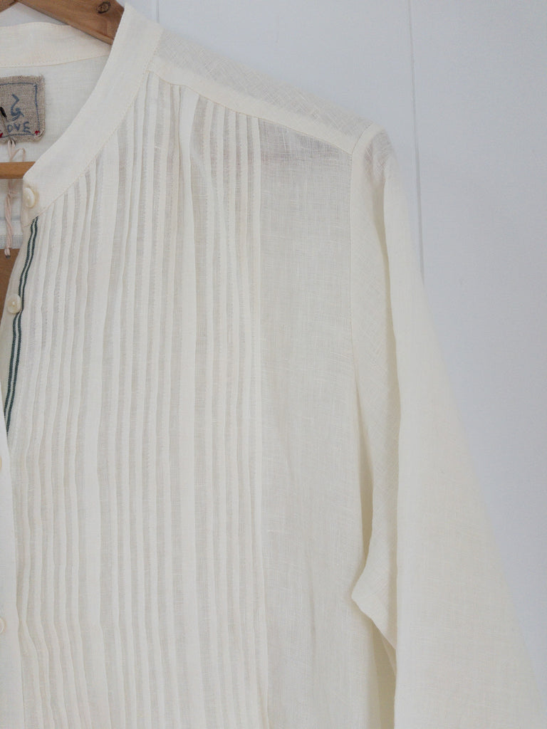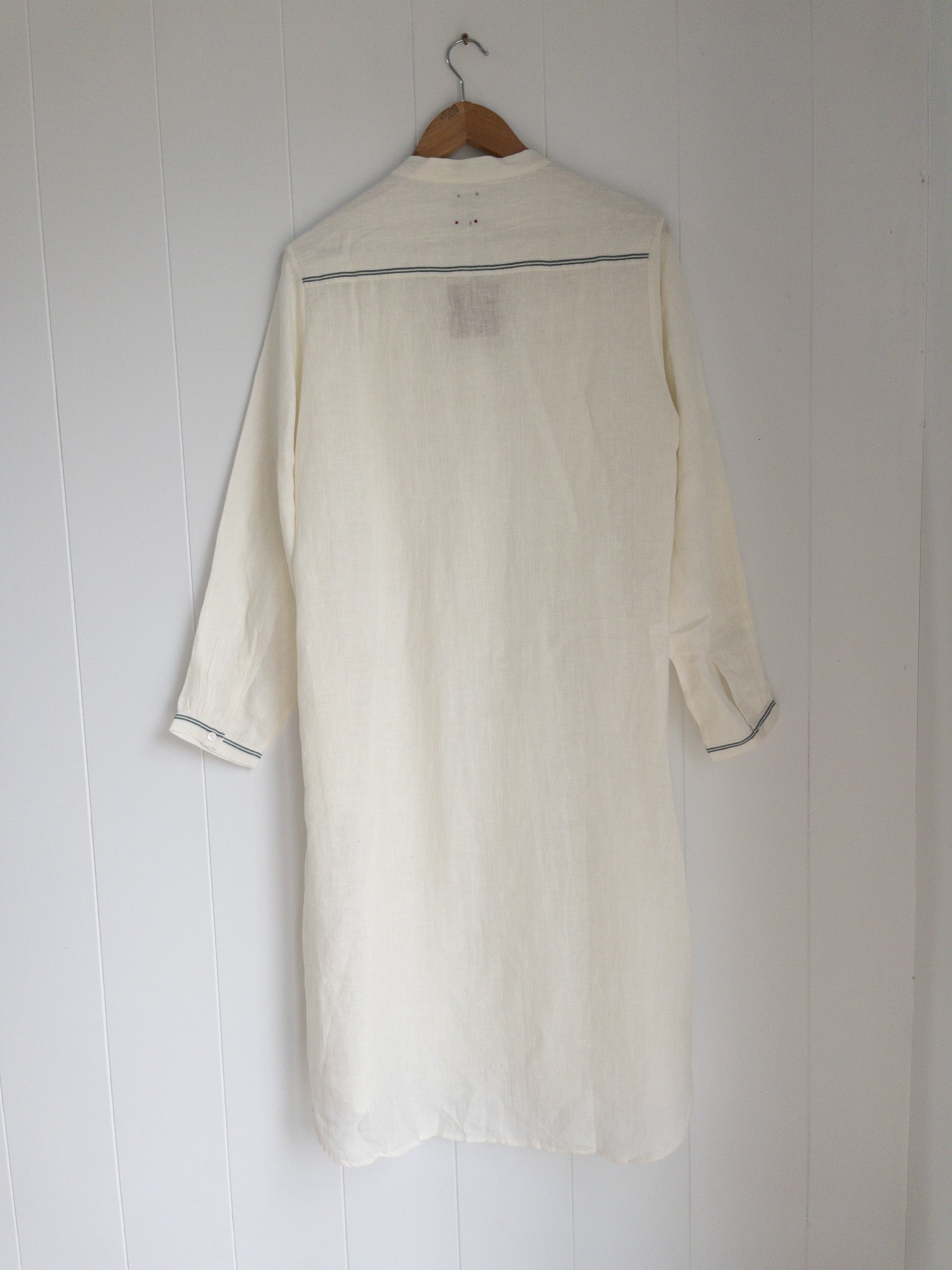 Beautiful button through relaxed shirt dress with stunning pintuck detail at front and simple madarin collar. Lovely contrasting double stripe of evergreen along the button line at cuffs and on back yoke. Concealed pockets in both side seams. Gorgeous effortless, easy wear, handwoven linen pintuck dress.