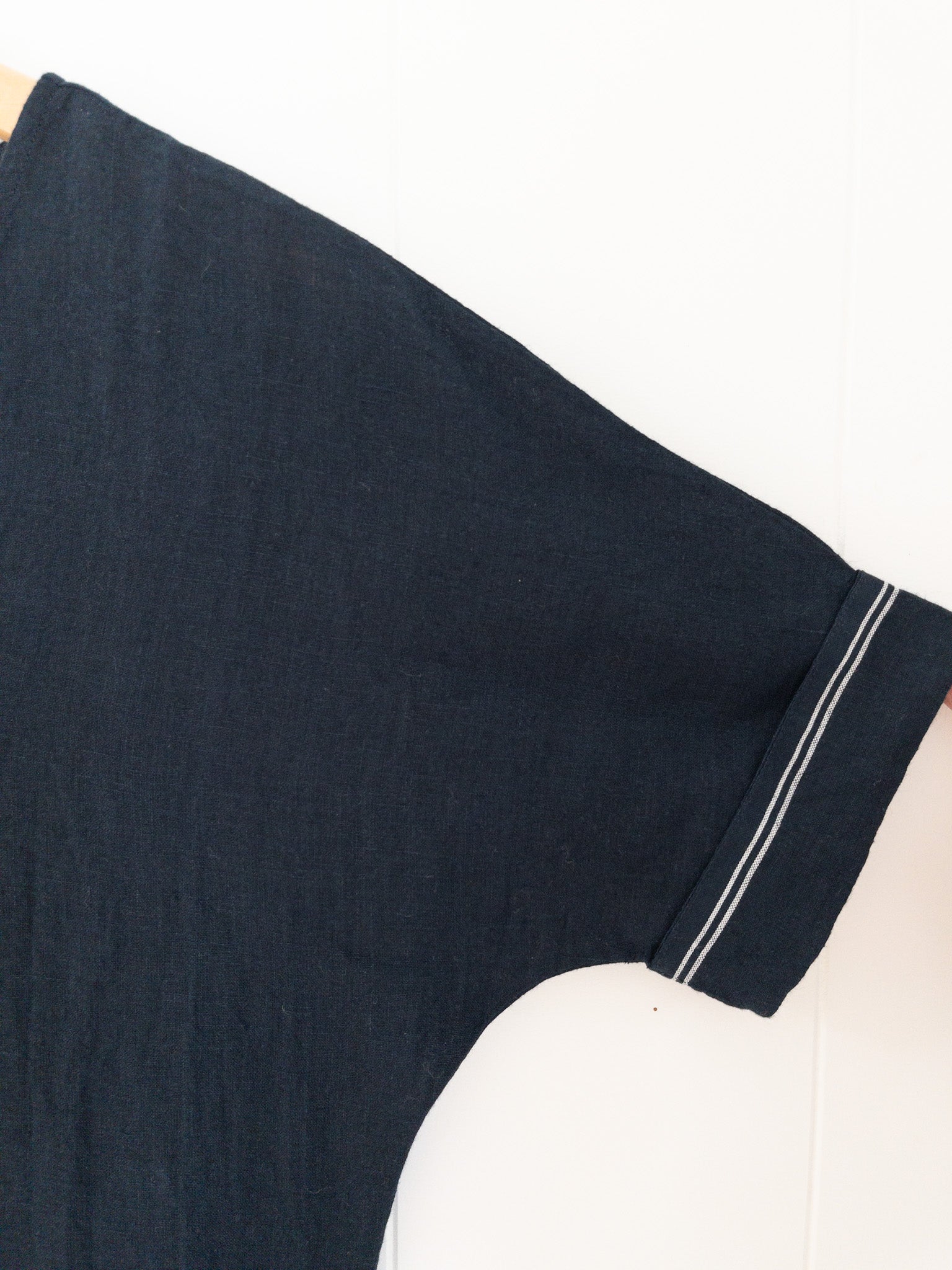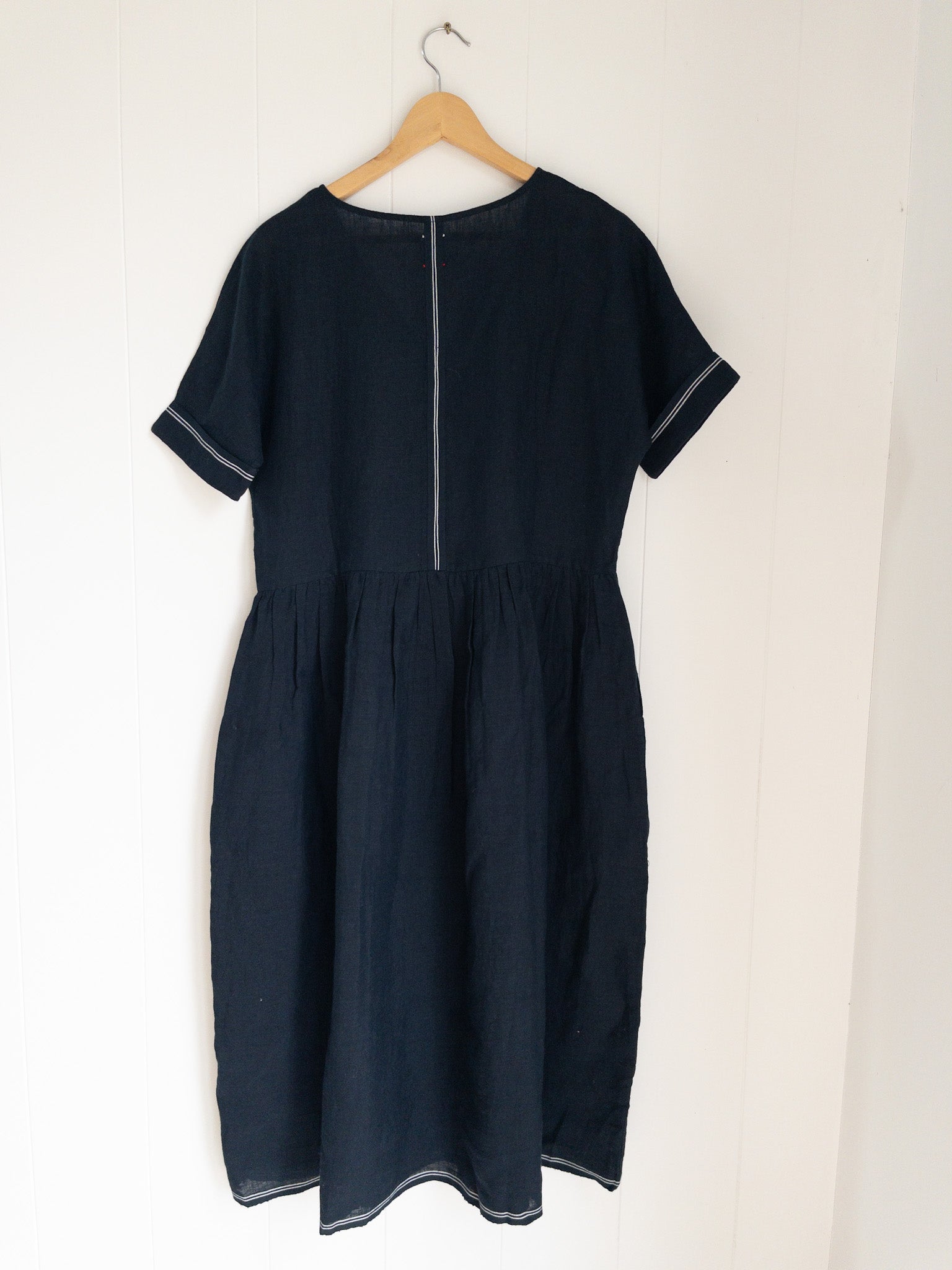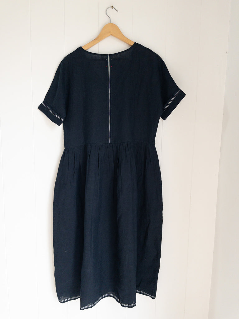 The gorgeous Rahi is a cross front style dress with gentle gathers from the waist, cuffed sleeves and practical in–seam side pockets. Finished with contrasts on the sleeves and at the unselvedged hem. This piece blends ease and elegance effortlessly.