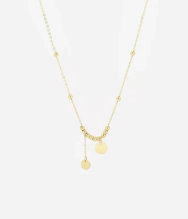Steel necklace plain or gilded with fine gold on which are threaded small steel balls and small geometric patterns.