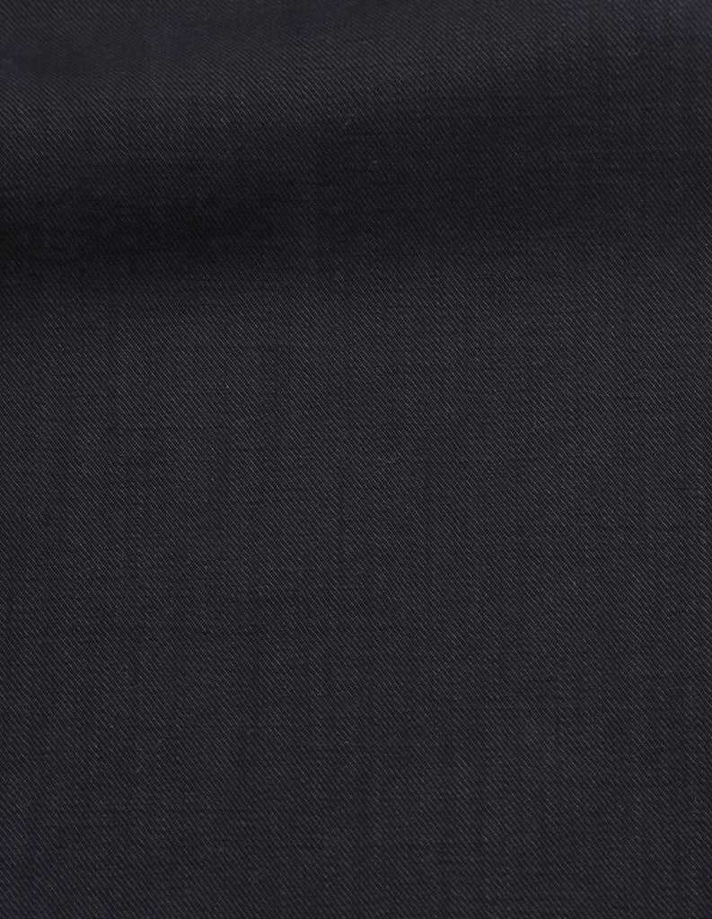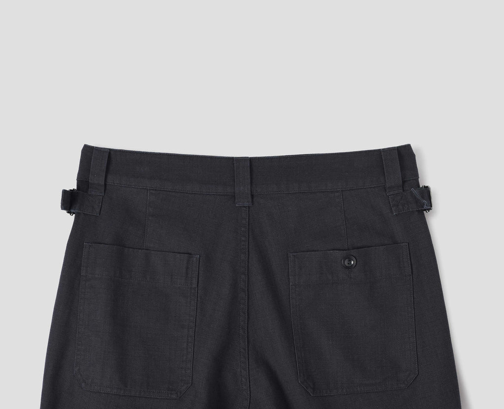 Cotton twill waist tab trousers. Relaxed cut. Button fly with button-through fastening. Side cinches. Slant pockets. Deep stitch hem. Patch and button-through patch back pockets.