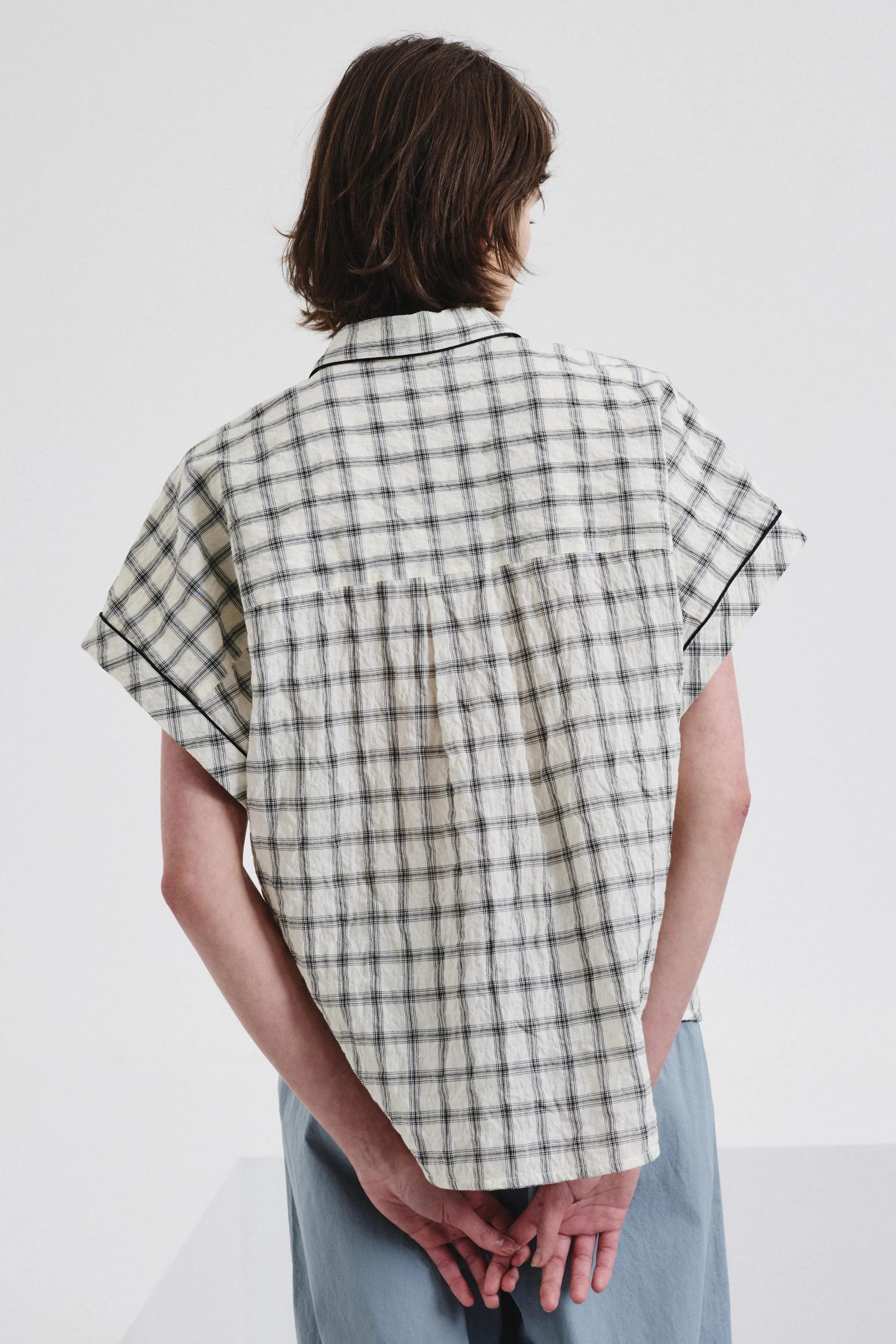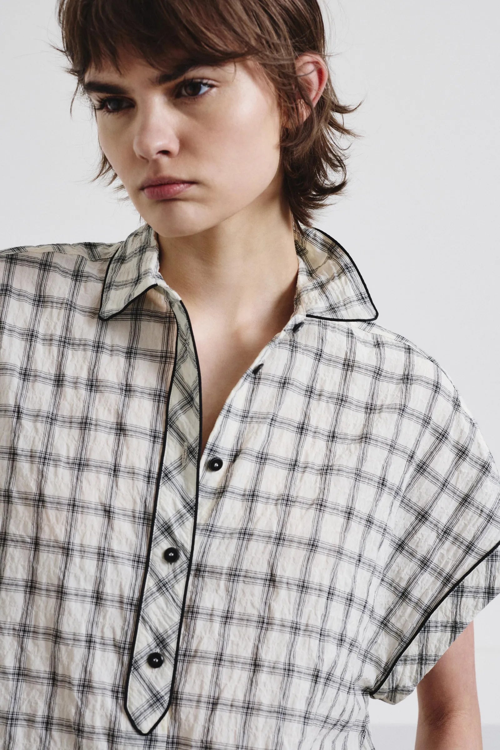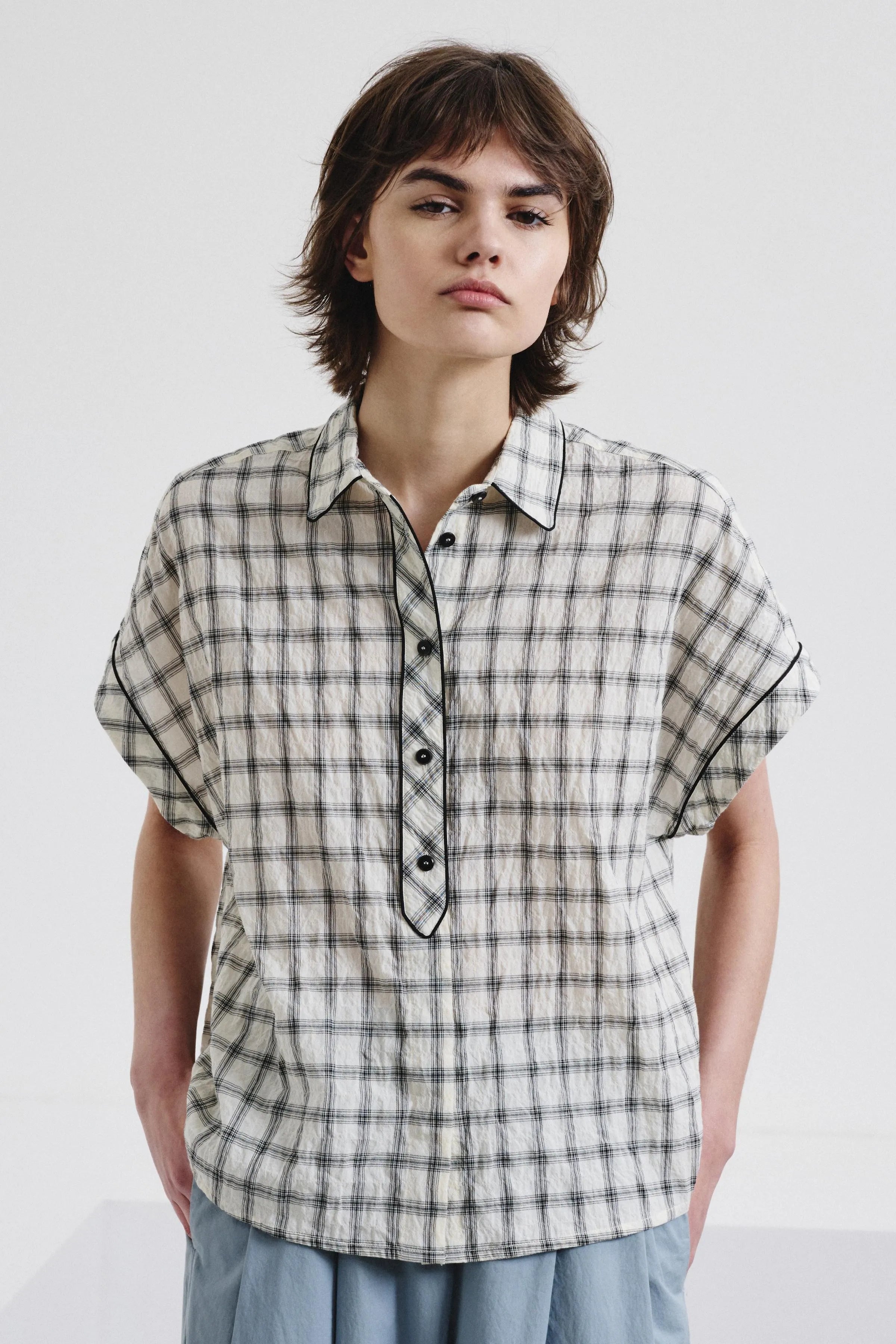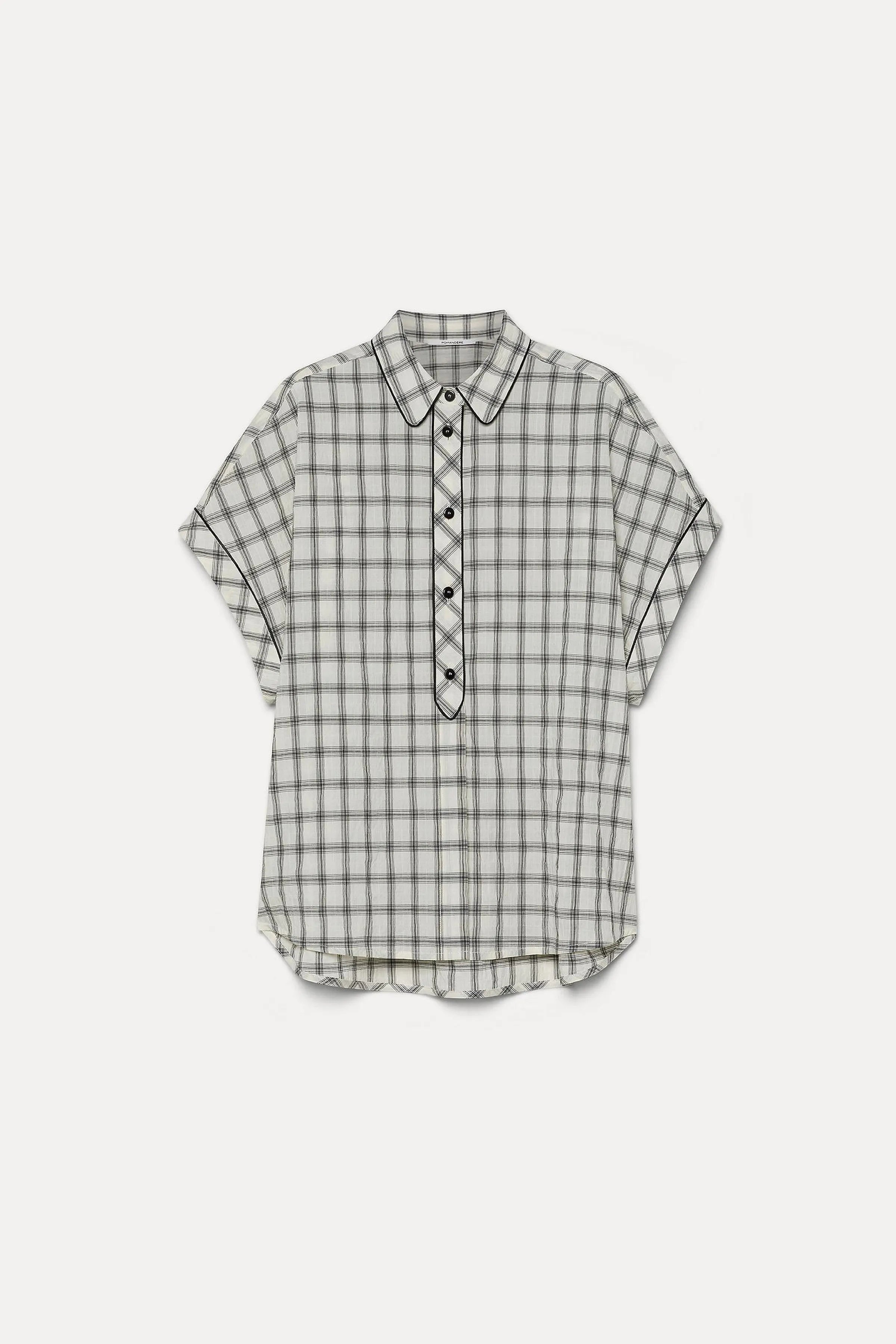 Delicate seasonal shades create a refined check pattern with a summery feel. The shirt features a clean, essential fit, with a hidden button placket that leaves only the top buttons visible. The design is completed with an elegant contrasting piping detail, a distinctive element that enhances the overall design.