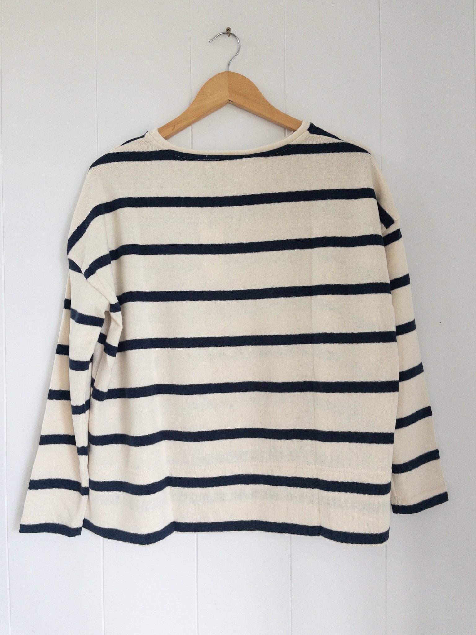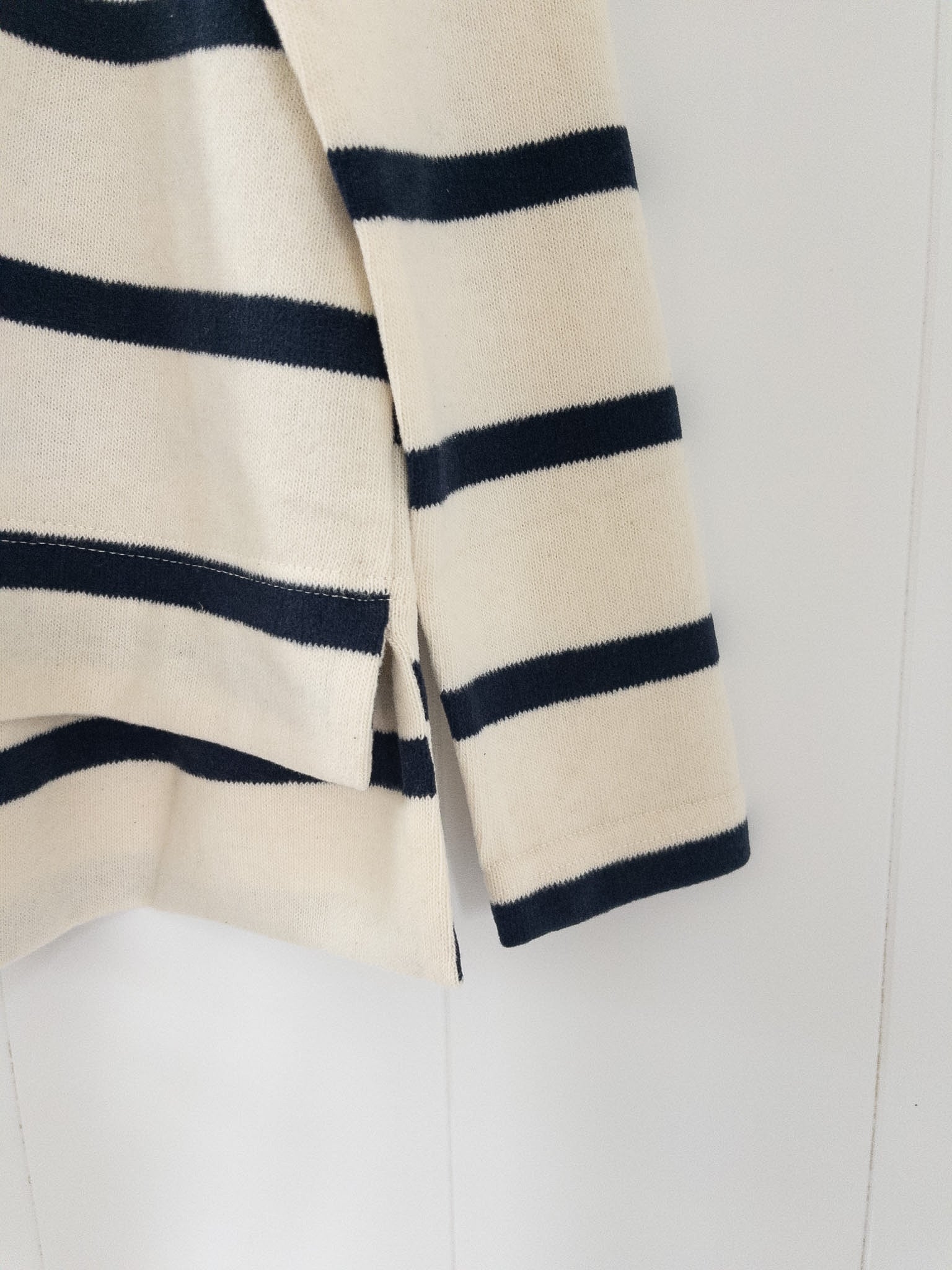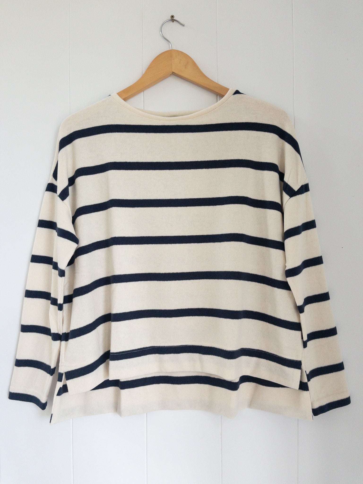 A boxy-fit Pullover from MAMA B crafted from their signature Cotton-Mix fleece fabric in a striped design. Features include a round neckline, dropped shoulders, fitted sleeves and a stepped hemline with side vents.