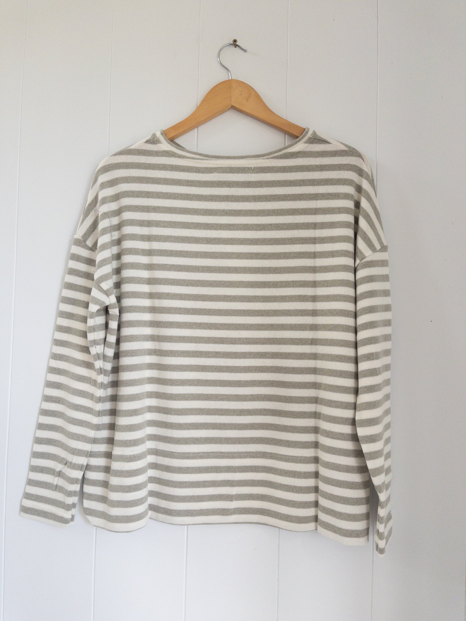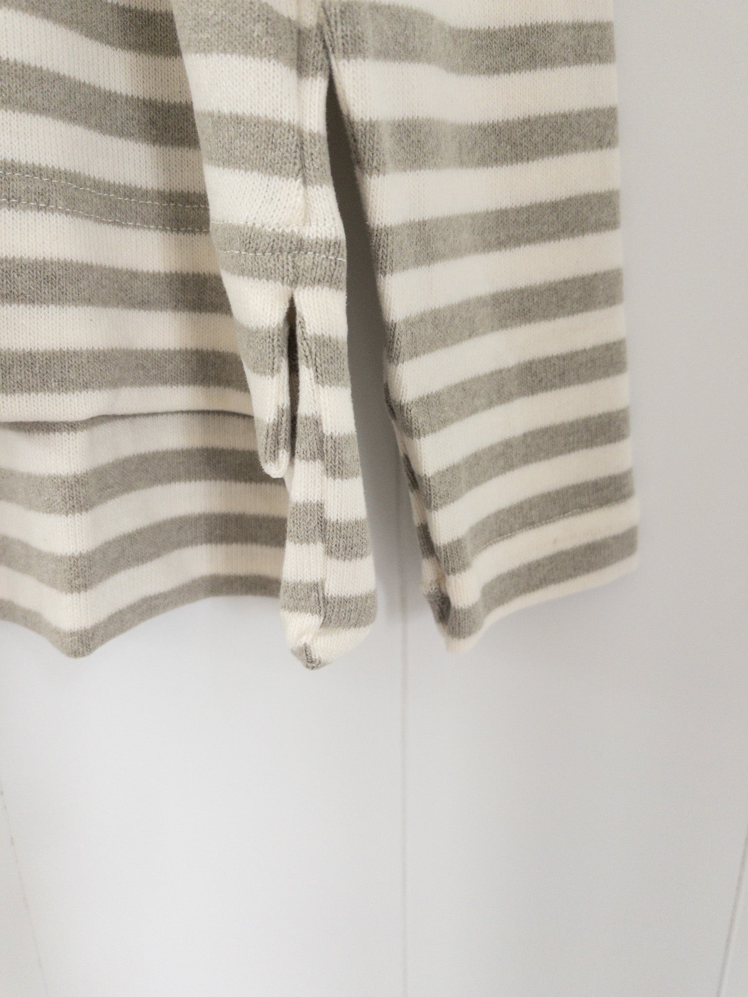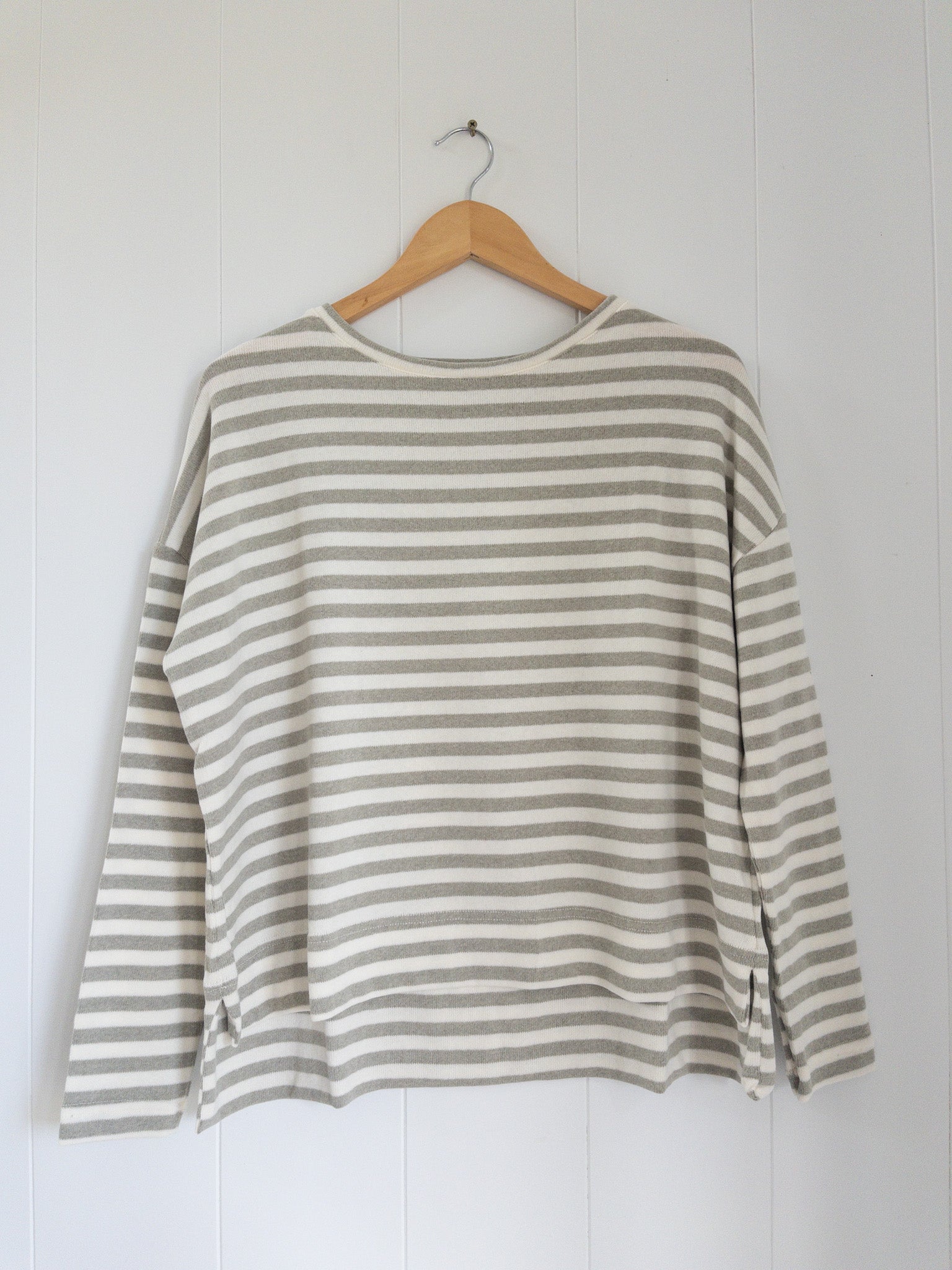 A boxy-fit Pullover from MAMA B crafted from their signature Cotton-Mix fleece fabric in a striped design. Features include a round neckline, dropped shoulders, fitted sleeves and a stepped hemline with side vents.