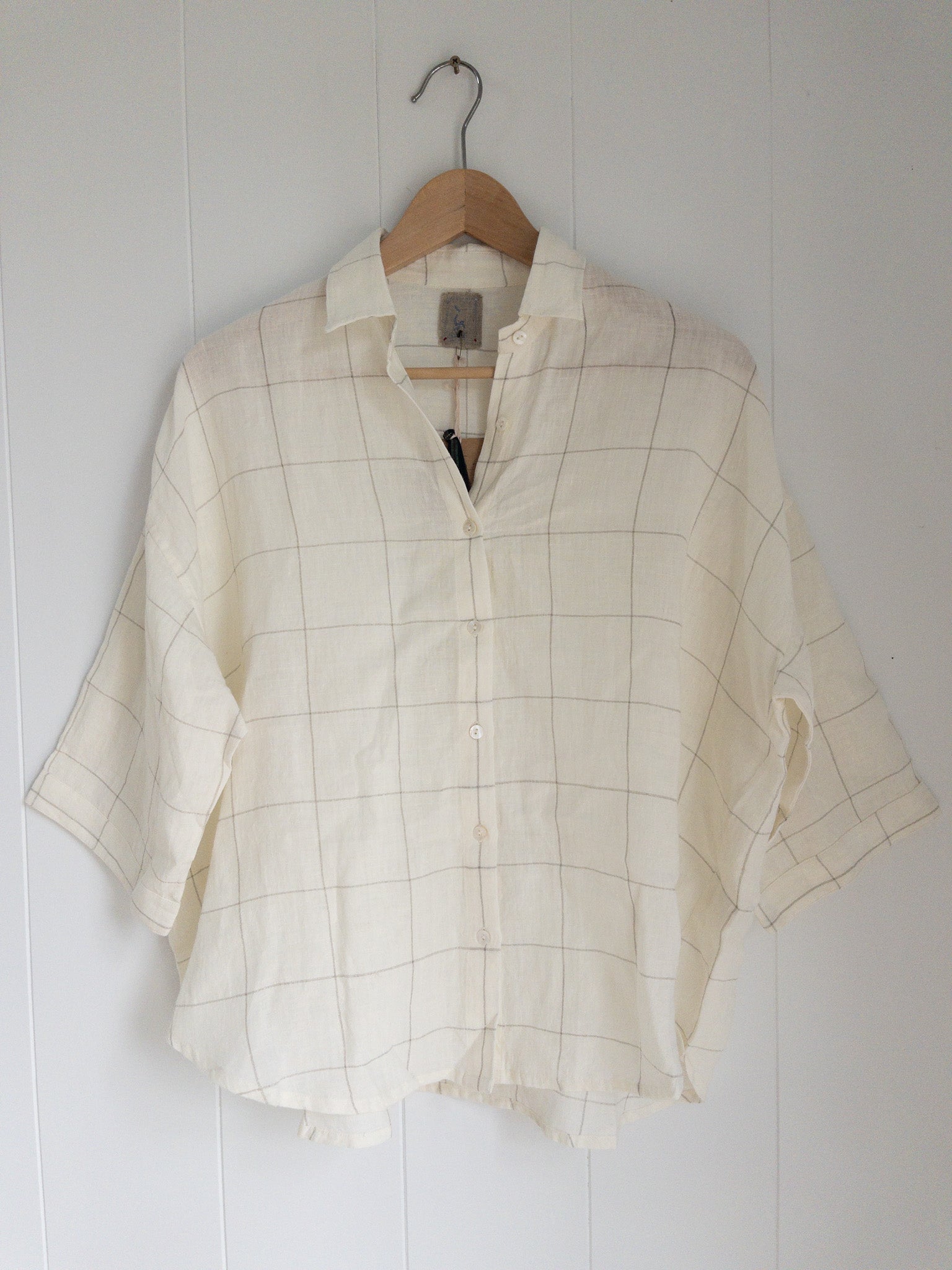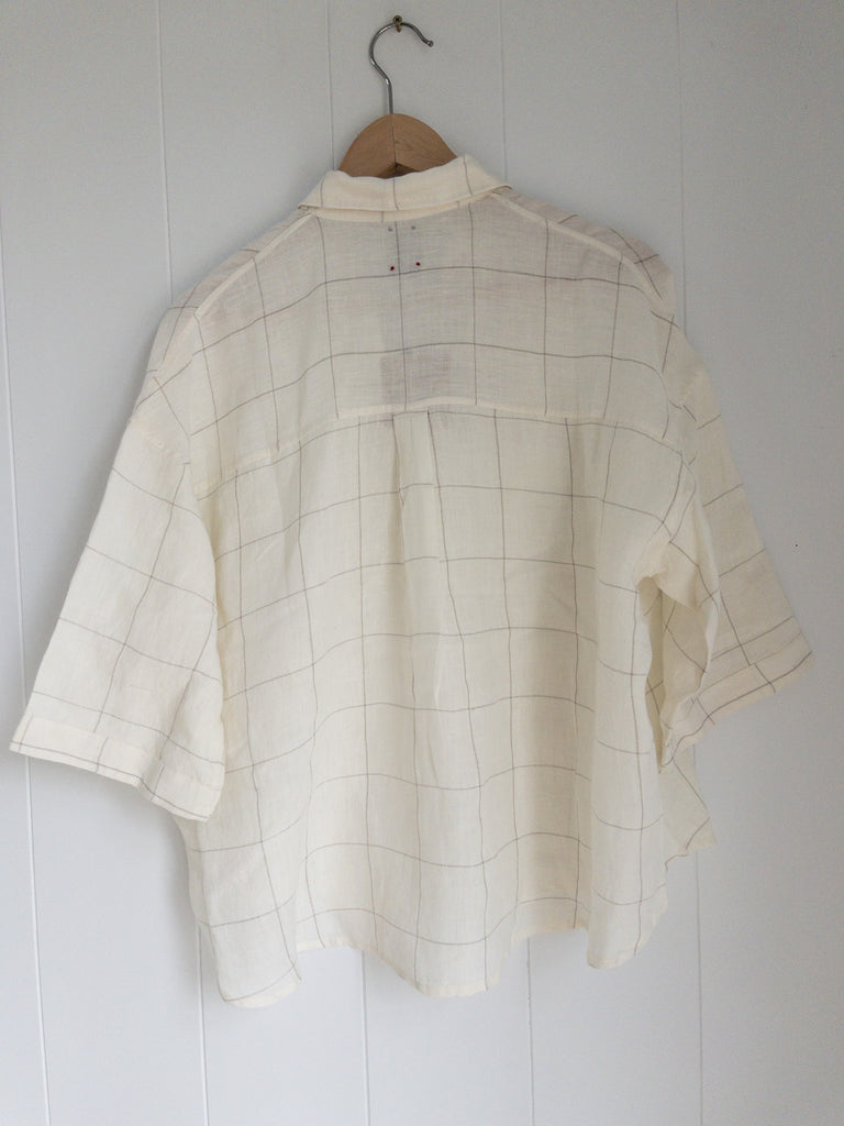 Pamini, in handloom white linen with a contrasting natural check, is a classic collared button up shirt. An easy-fit boxy style, it has below elbow length sleeves and an inverted pleat at the back, cuffs and button band.