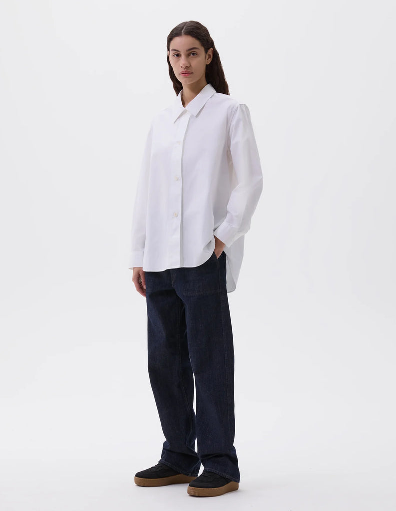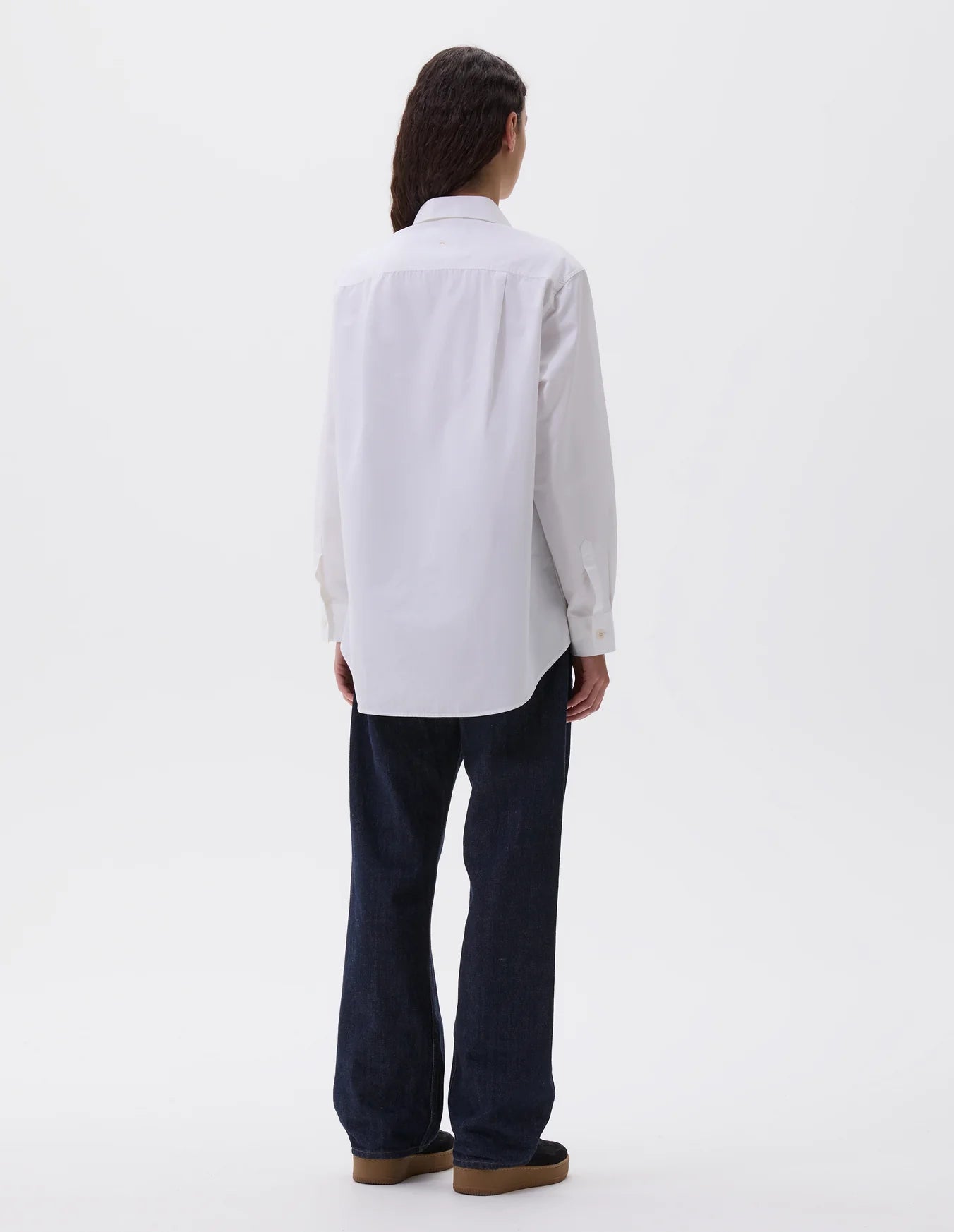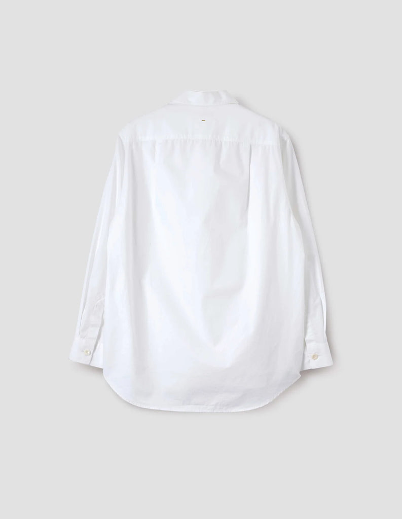 The MHL. Longline Shirt has a relaxed cut and longer length and is fabricated in compact cotton poplin with a lightly brushed, papery hand feel. The minimalist shirt is constructed with a wide stitch-through placket and a pleated back yoke with an elongated hem.