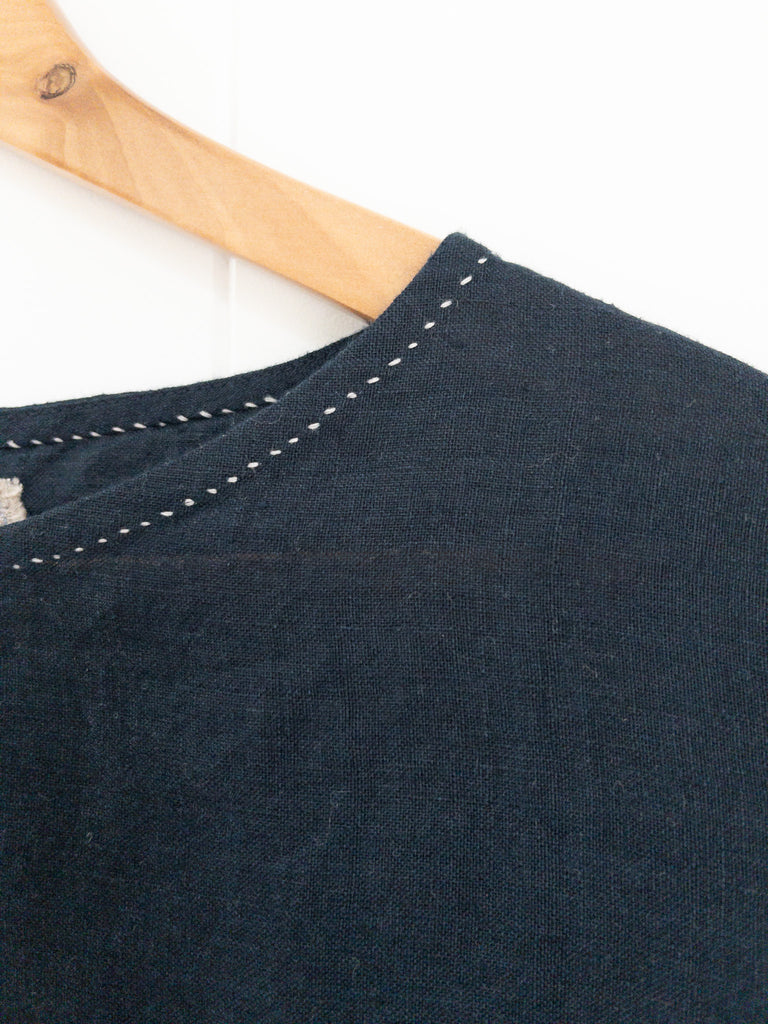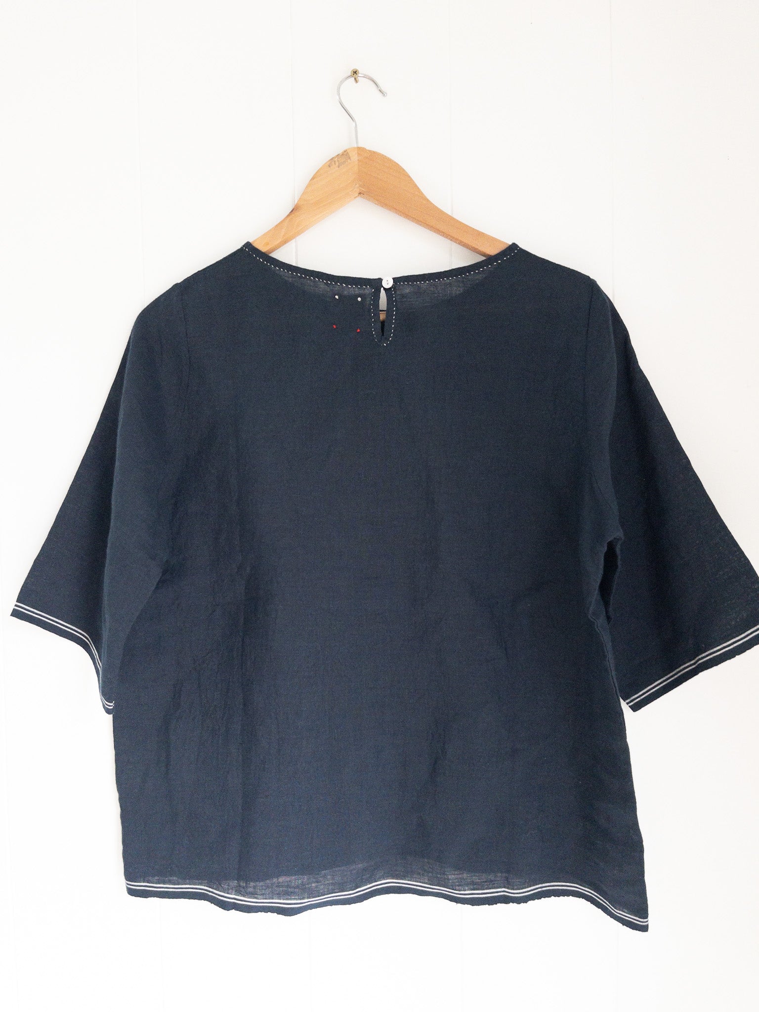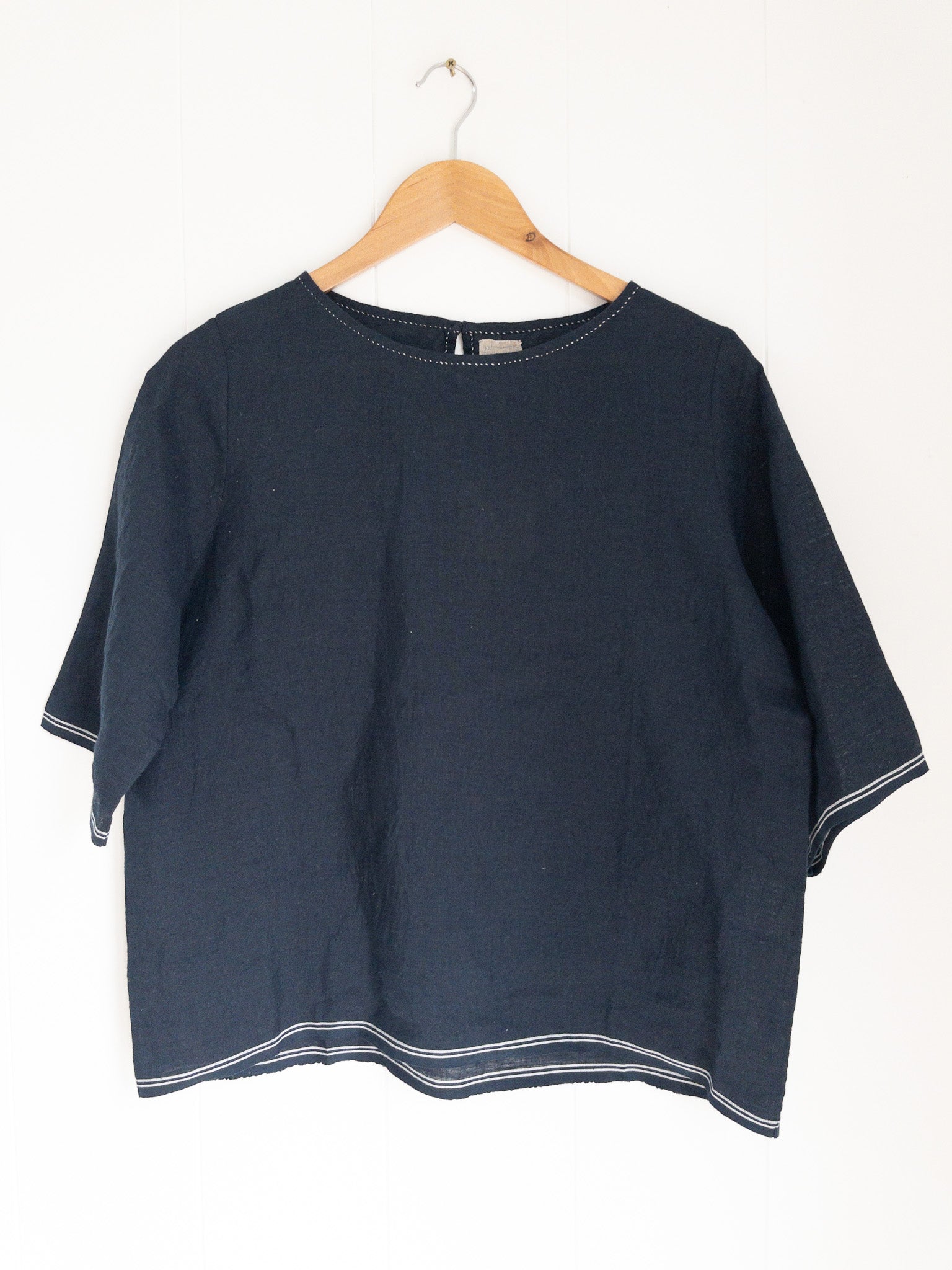 The Karalika is a lovely classic slim fitting top. Featuring elbow length sleeves, back button closure and selvedge edges with contrasting finishes on the sleeve and hem.