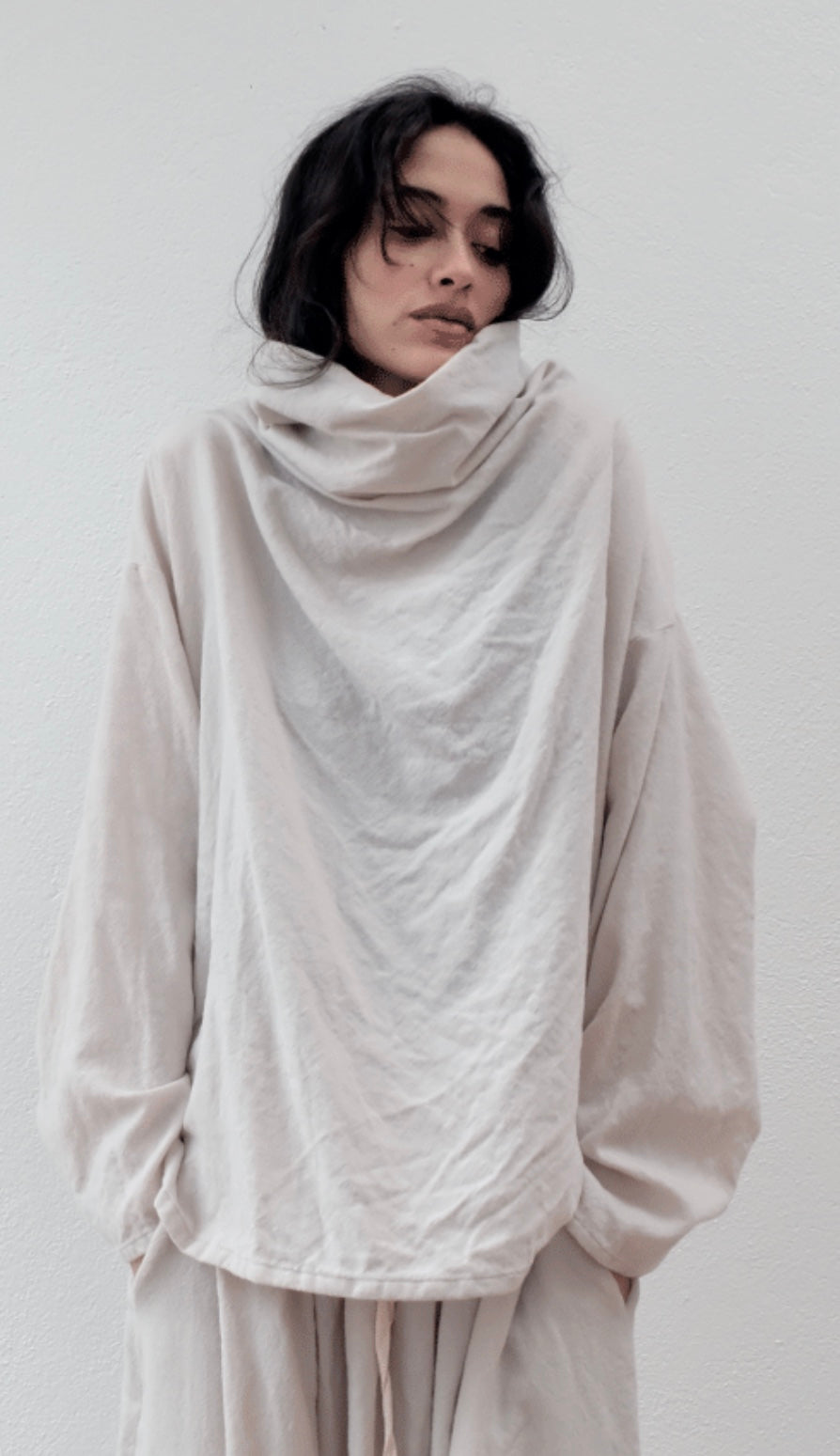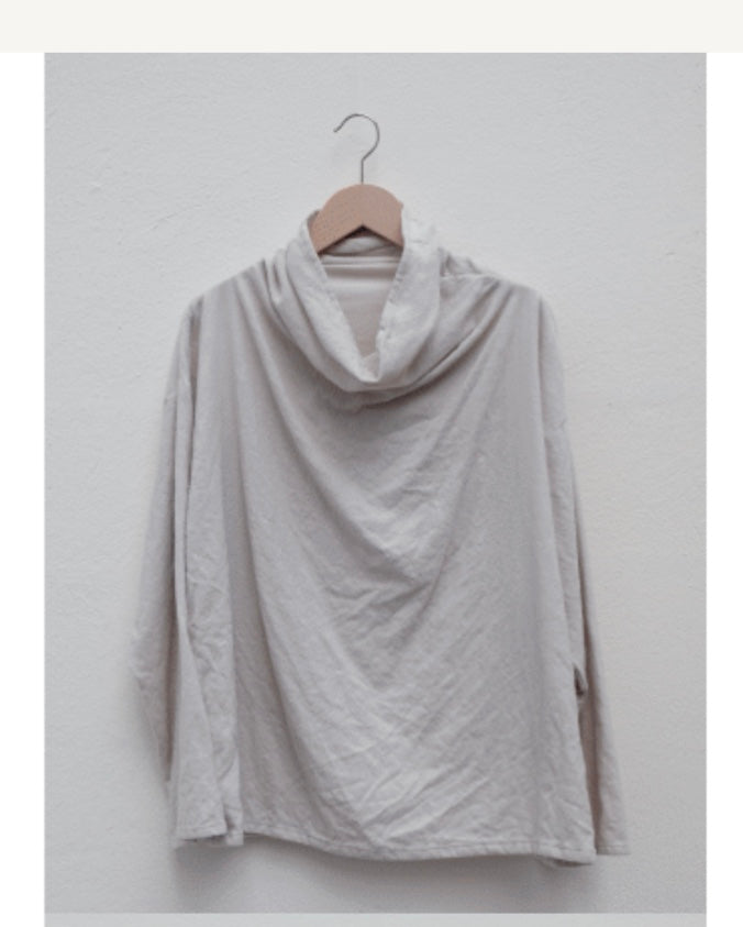 This loose fitting top is designed with a wide high collar, with no seams at the neckline and long sleeves. Length 63cm from shoulder.