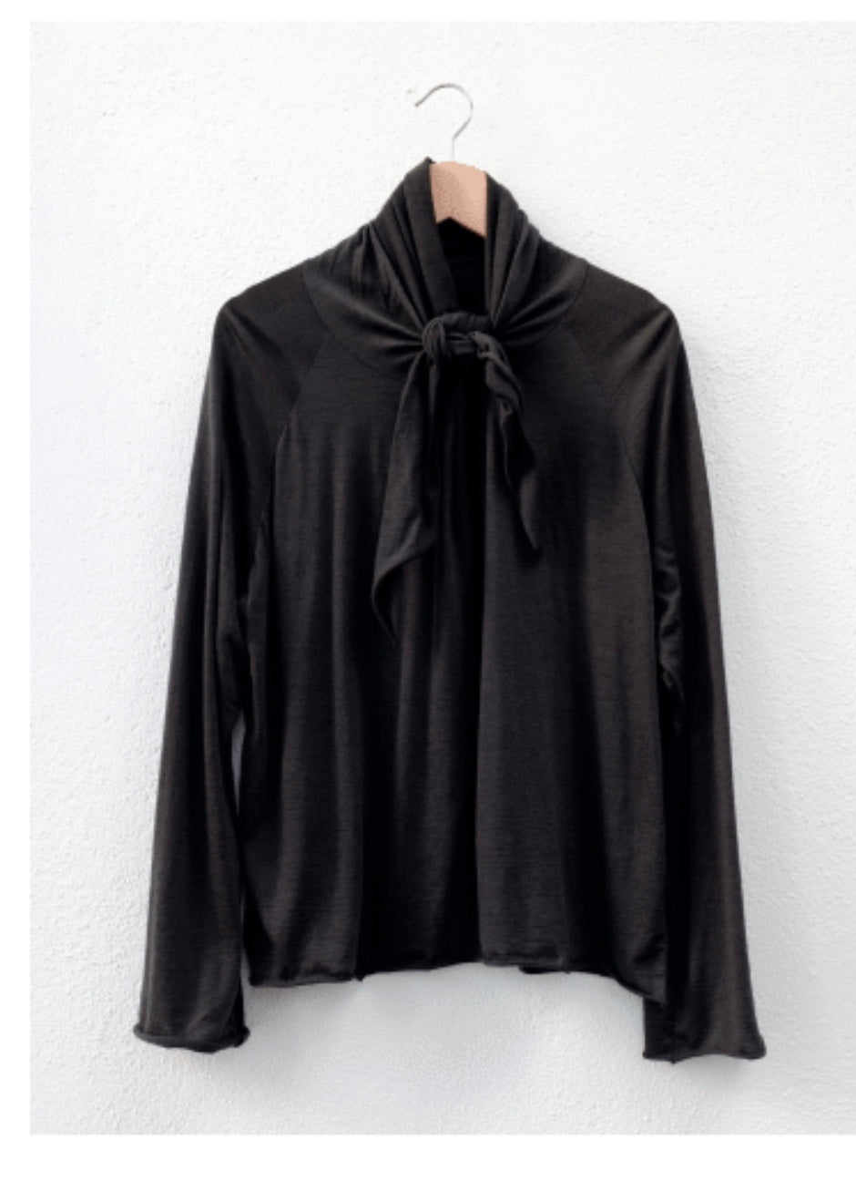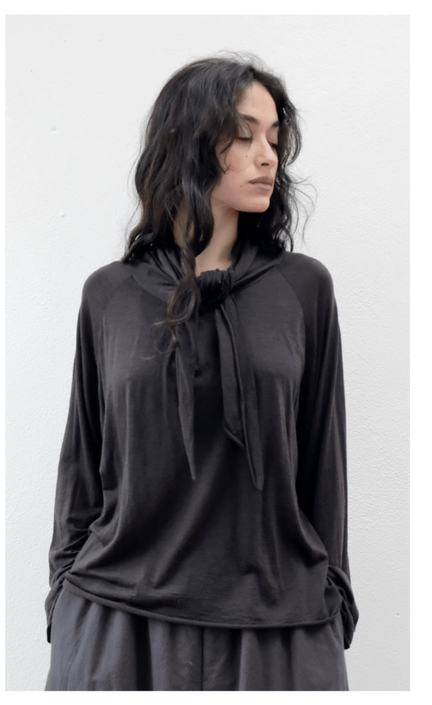 This lightweight raglan top features a round neckline that extends into an integrated scarf tied around the neck, also with pleats at the front. It is finished with natural roilled up edges.