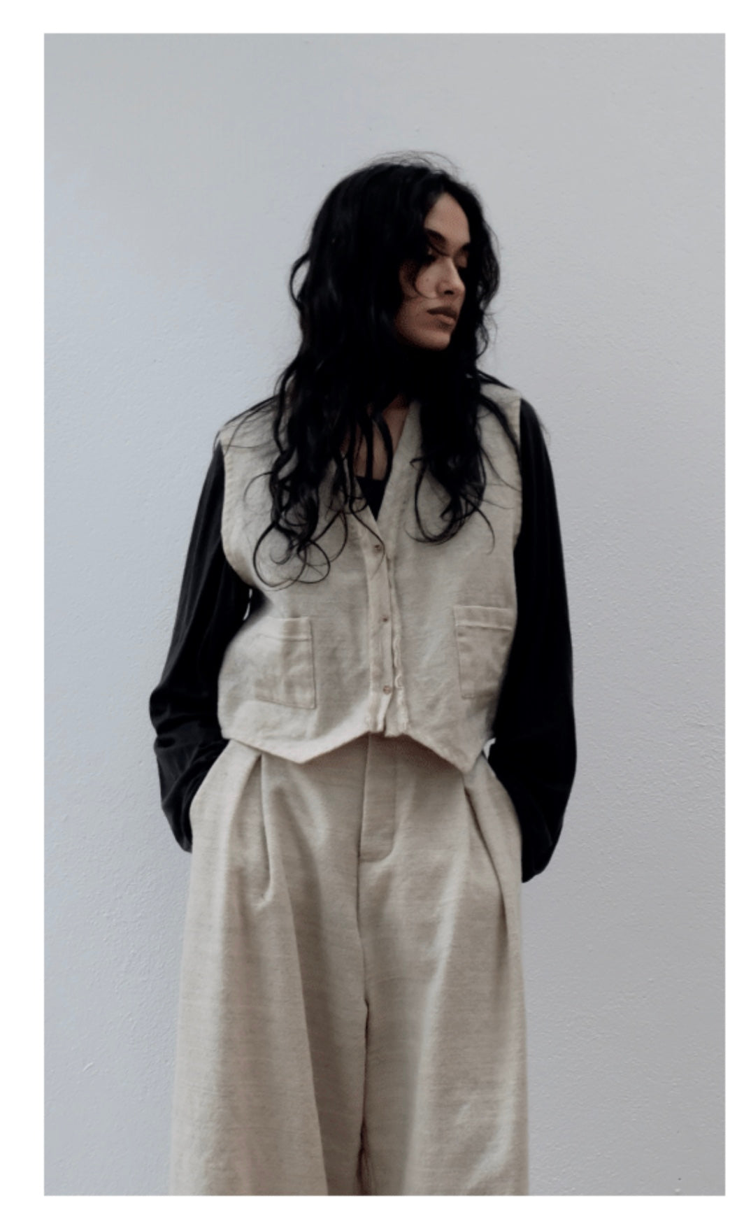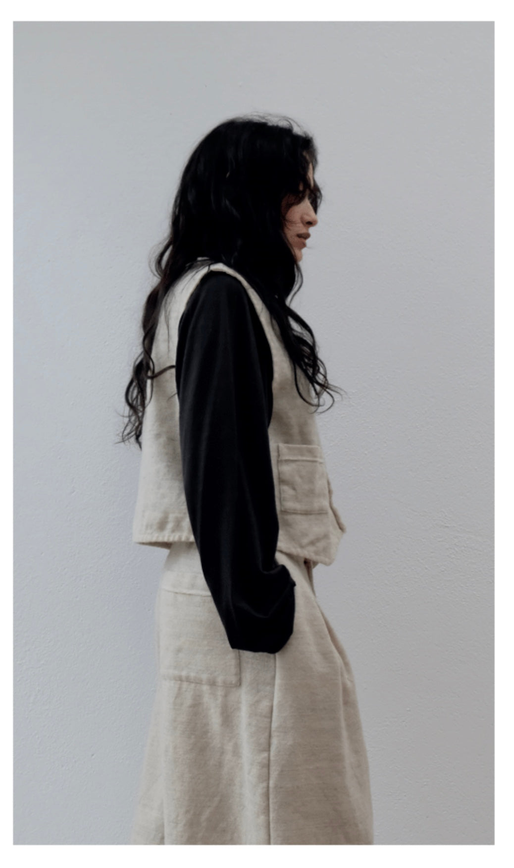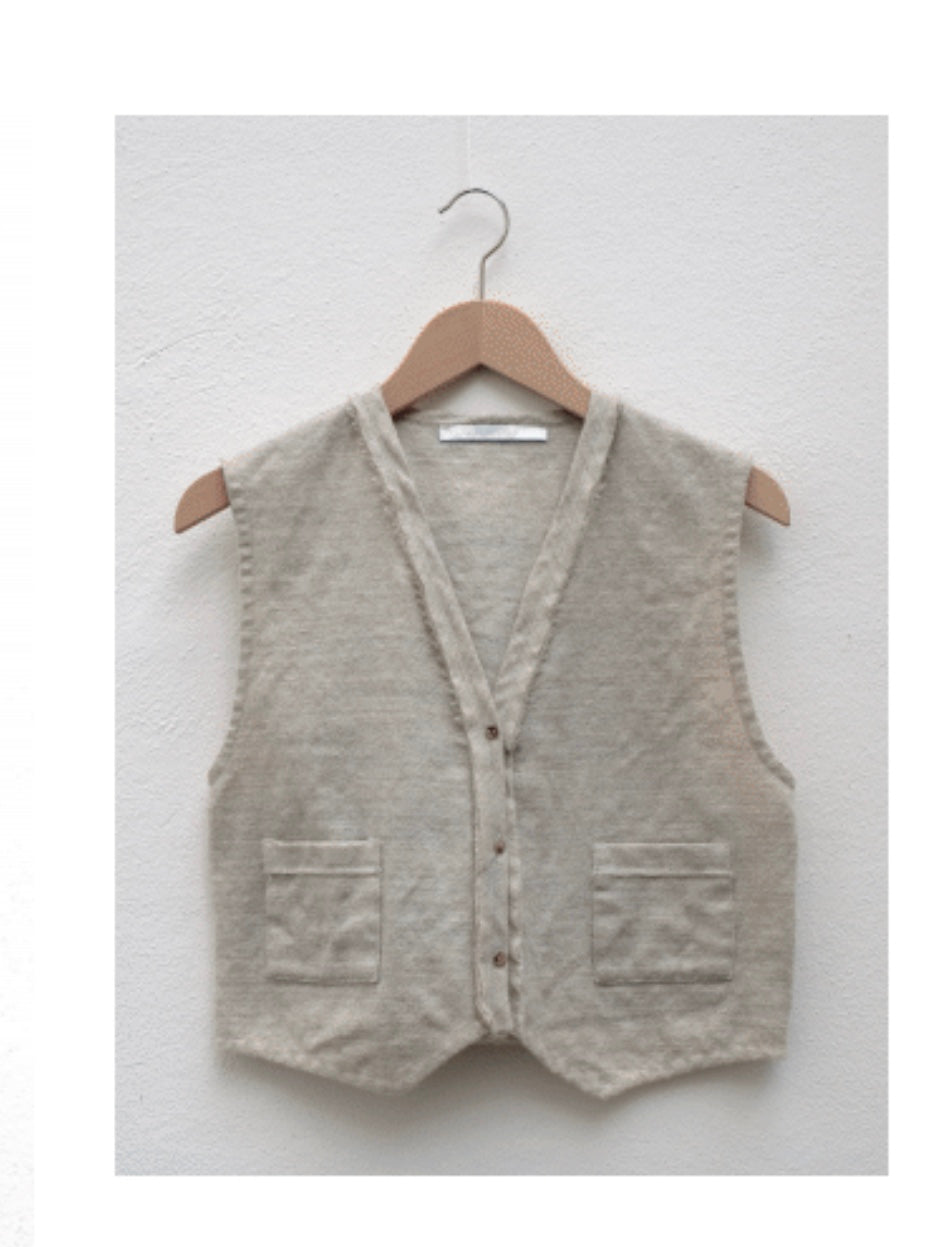 This vest is fastened with three horn button and features a diamond shaped hemline at the front. It features two small patch pockets and a neckband, both with raw edged hems.