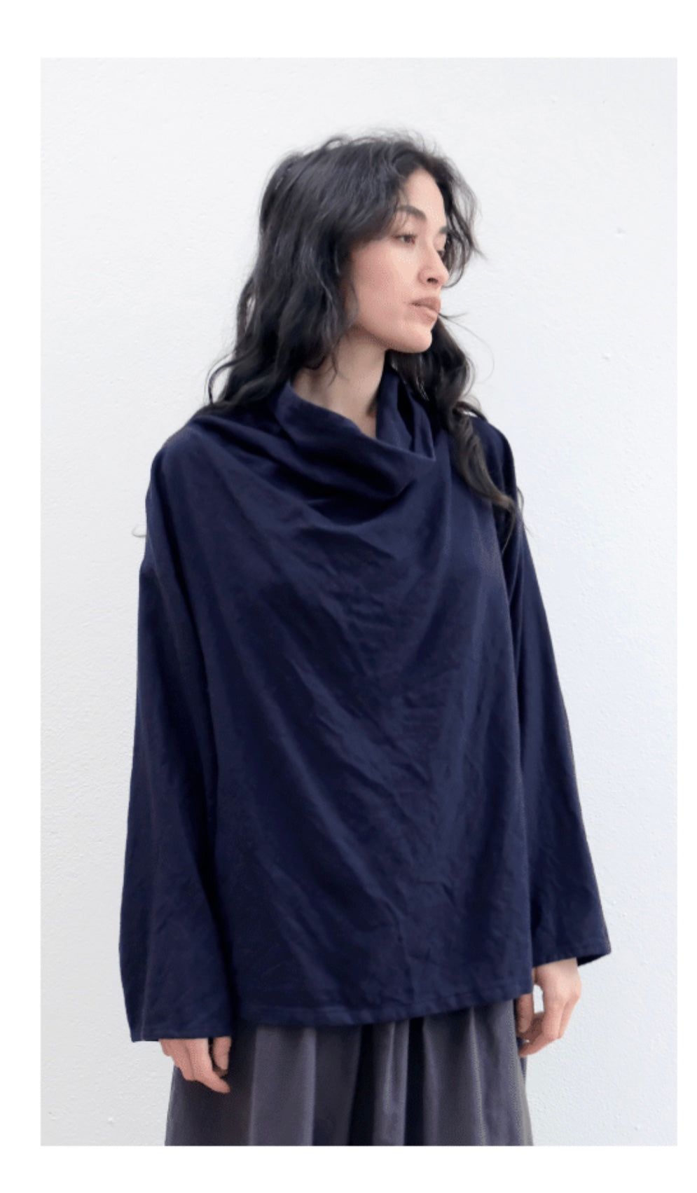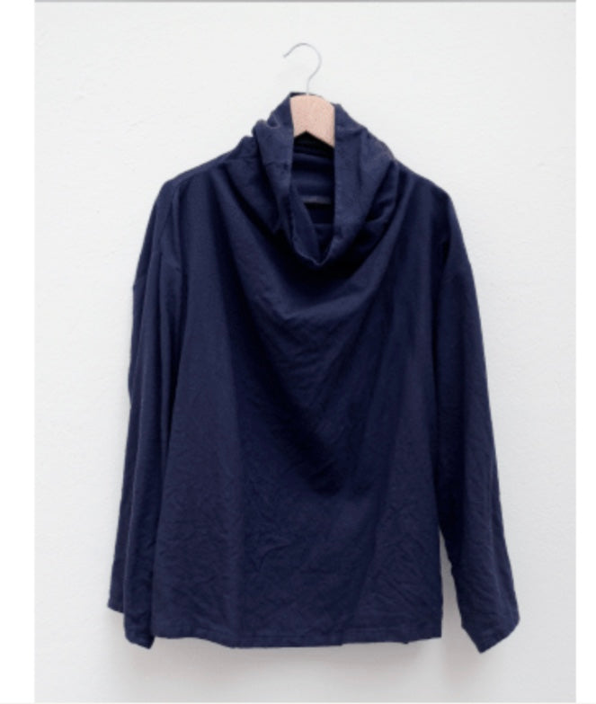 This loose fitting top is designed with a wide high collar, with no seams at the neckline and long sleeves. Length 63cm from shoulder.