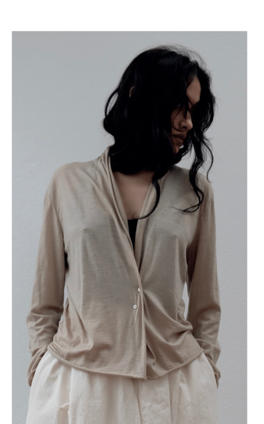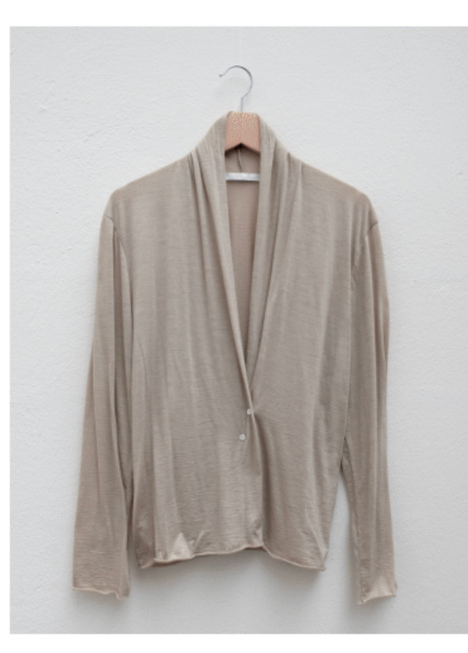 This cardigan is seamless at the sides and slightly up the neck, fastened with mother of pearl buttons. It is finished with naturally rolled edges.