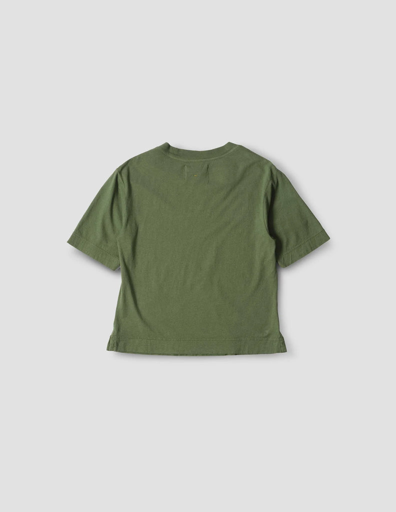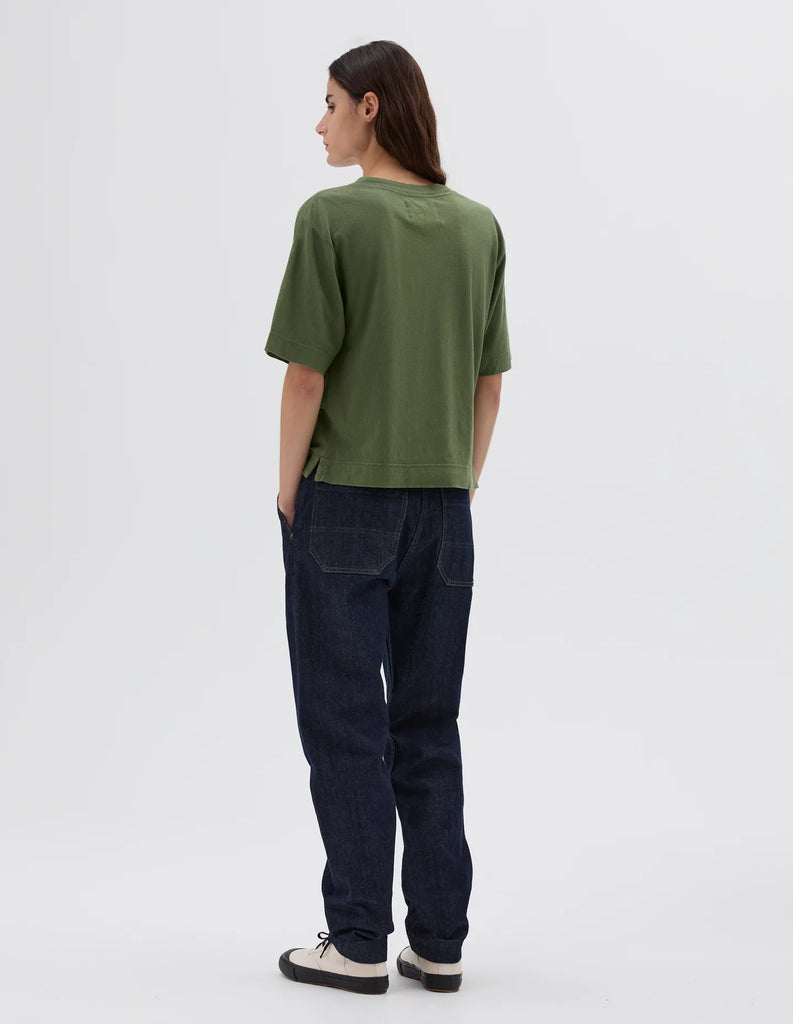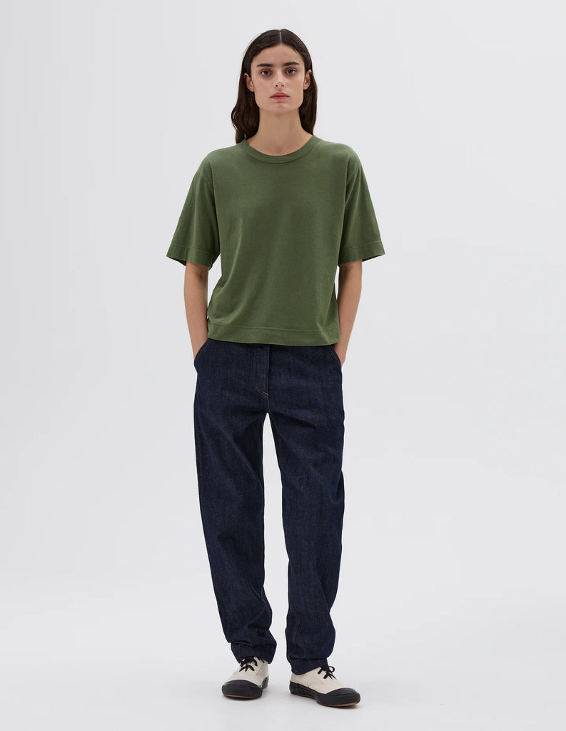 A simple T-shirt with a relaxed boxy fit and side split detail. A lightweight organic cotton linen blend jersey.